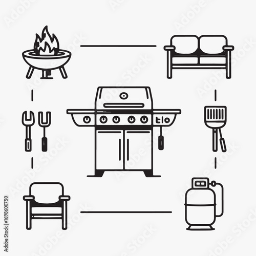Backyard firepit outdoor features line icon set. Vector pictograms of kitchen, patio, fireplace, chiminea, pizza oven, firewood, propane tank, thin linear.eps