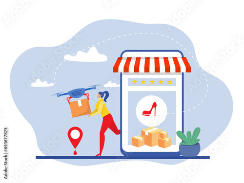 Man delivering flowers to a young woman using drone quadrocopter vector Illustration on a white background