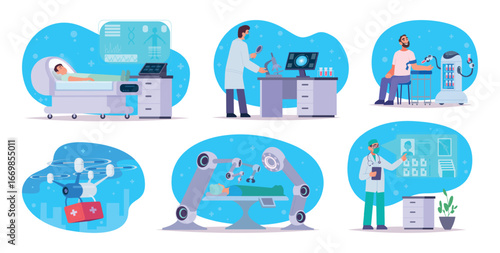 Various drones displayed in isometric design, floating on a blue background, symbolizing technology and innovation. Vector illustration