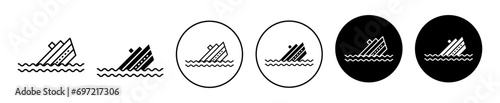 Black Sinking cruise ship icon isolated on white background. Travel tourism nautical transport. Voyage passenger ship, cruise liner. Circle button. Vector.