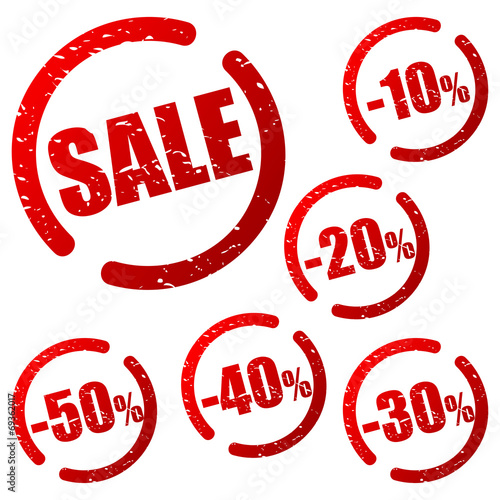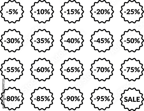 Naklejki ze zniżką na wyprzedaż. Specjalne ikony rabatowe. Etykiety sprzedażowe. Symbol kampanii reklamowej w sprzedaży detalicznej, promocja sprzedaży, naklejka z rabatem 10%, 20% i 50%.