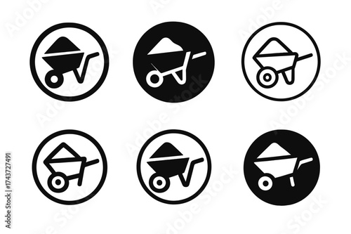 Wheelbarrow Logo Variations. Wheelbarrow with cement. Set Logo of circle emblem: wheelbarrow with cement framed inside circle. harmonious logo variations of