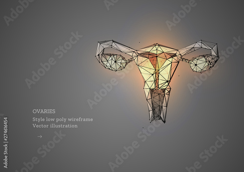 Ovaries. Low poly wireframe style. Female reproductive organs uterus and ovaries health care. Abstract illustration isolated on gray background. Particles are connected in a geometric silhouette.