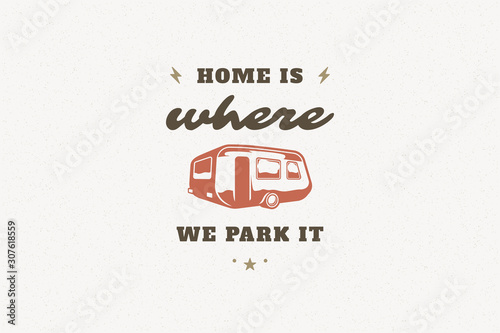 Camping badge design. Outdoor adventure logo with quote - Home is where we park it, for t shirt. Included retro camper van trailer and wanderlust patches. Unusual hipster style. Stock vector isolated