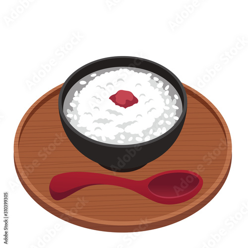 Kayu (Okayu), traditional Japanese rice porridge with umeboshi pickled plum. Cartoon vector clip art illustration.