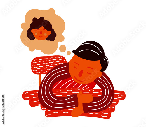 Cute little boy sleeping in his bed and dreaming something. Hand drawn cartoon doodle vector illustration.
