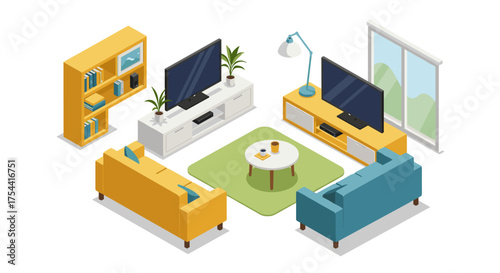 Modern isometric living room interior design with colorful furniture and electronics