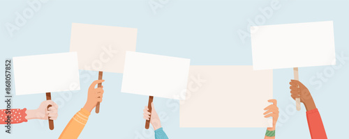 People presenting, Men, women hold empty banner mockups. Colorful vector illustration