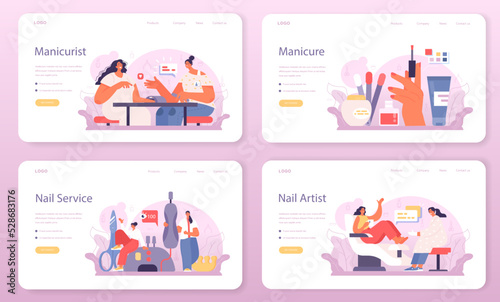 Nails salon banners set. Manicure, pedicure beauty procedures ad posters, studio interior with reception desk, furniture, appliances, table, clients transforming armchair Cartoon vector illustration