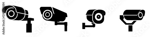 Security icons set with lock, key, shield, alarm, camera, security guard, surveillance, access control, biometrics, safe icon. Simple retro vector