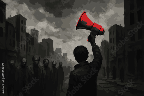 Black and white illustration of a city with destroyed and crumbling buildings in a post-apocalyptic setting