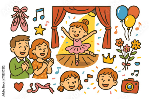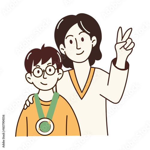 Celebrating Reading Success. Colorful Hand-drawn doodle Children illustration Parents celebrating reading achievement open book, glasses, proud parents,