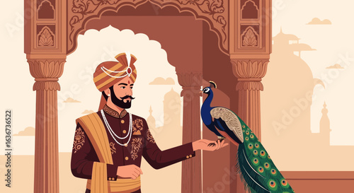 Successful businessman - Man standing on mountaintop in front of sunrise, being proud of business and career accomplishments. Vector illustration