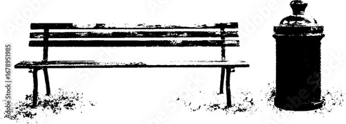 Black and white street scene stencil set featuring bench and trash can for urban design
