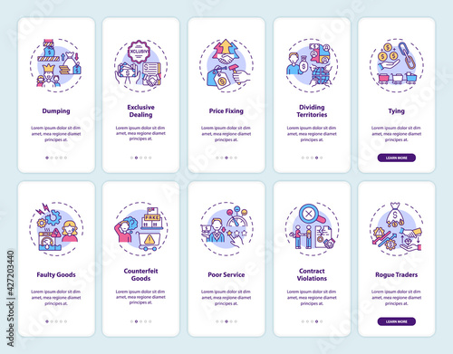 Business practices onboarding mobile app page screen with concepts set. Consumer protection walkthrough 5 steps graphic instructions. UI, UX, GUI vector template with linear color illustrations