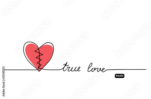 True love heals text.  Broken heart minimal vector illustration and lettering.