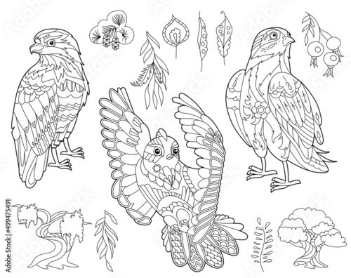 Contour linear illustration for coloring book with decorative falkon. Beautiful predatory bird, anti stress picture. Line art design for adult or kids in zen-tangle style, tatoo and coloring page.