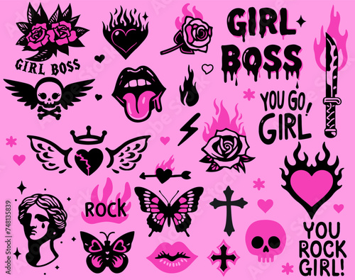 Trendy gothic stickers with roses, hearts and other girlish tattoo style elements. Set of vector illustrations in black and pink colors.
