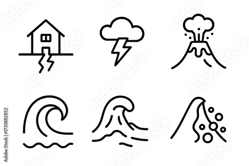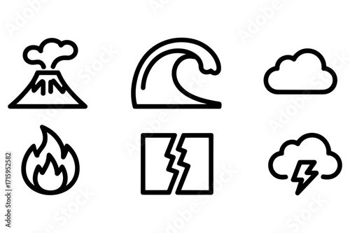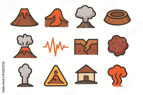 Natural disaster icons set featuring lava, magma, seismic waves, and heat