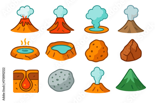 Colorful Doodle Style Geology and Earth Science Icon Set.