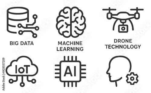 Innovation technology icon set with high tech digital wireless smart future business sign: artificial intelligence (AI), machine learning (ML), internet of things (IoT), cloud computing, big data.