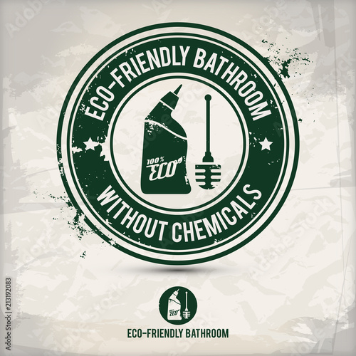 alternative eco friendly bathroom stamp containing: two environmentally sound eco motifs in circle frames, grunge ink rubber stamp effect, textured paper background, eps10 vector illustration