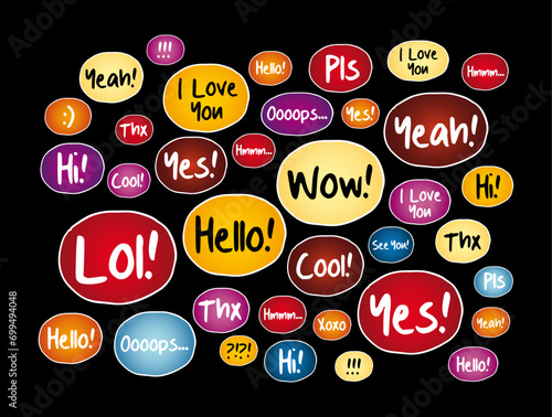 Speech bubble set with conversation phrases and words in isolated vector illustration.