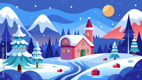 A snowy village at night with mountains, trees, houses, a church, and a full moon under a starry sky in blue tones