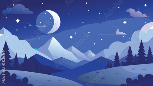 Enchanting crescent moon over snowcapped mountains under starry night sky vector
