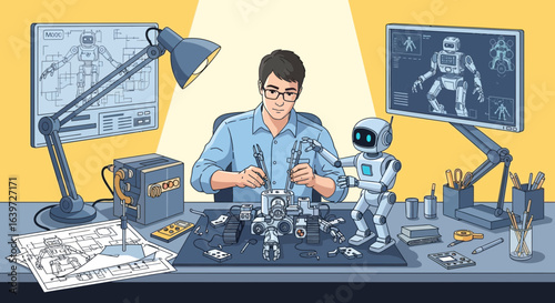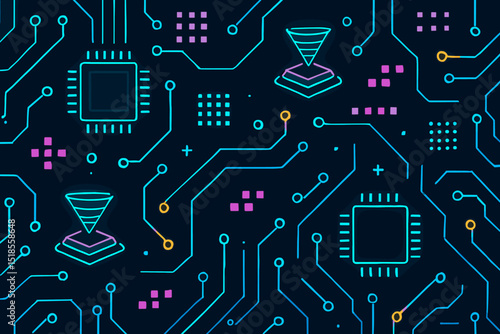 Abstract AI circuit board background. Technology connected blue lines with electronics elements on tech bg. Computer motherboard with a chip, processor, and semiconductor. Digital vector illustration