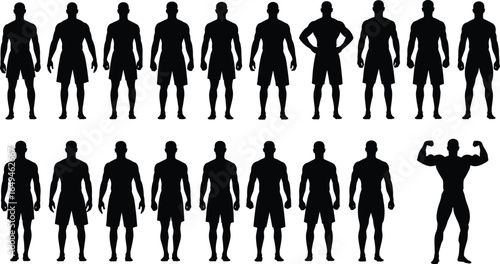 Set of muscular men and bodybuilder silhouettes in various fitness poses