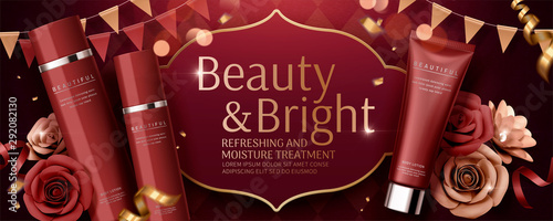 Moisture cosmetic tubes banner ads. Skin care cosmetic product bottles with soap bubbles. Lotion, perfume packing with waterdrop effect design. Realistic 3d vector illustration