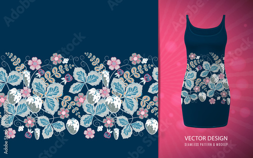 Flower embroidery on dress mock up. Fashion decoration patch realistic 3d vector illustration woman clothes. Traditional flower seamless border textile print vintage art