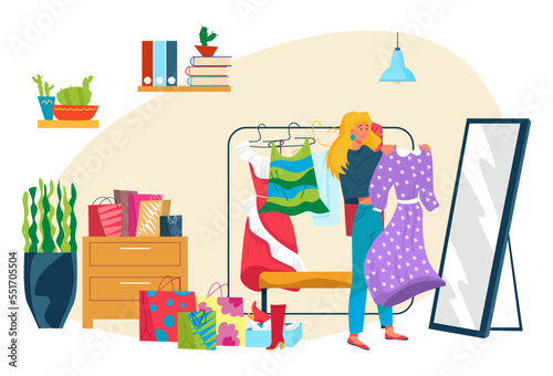 Cute little girl daily routine. Kid woke up in morning and choosing dress cartoon vector illustration