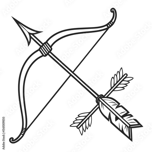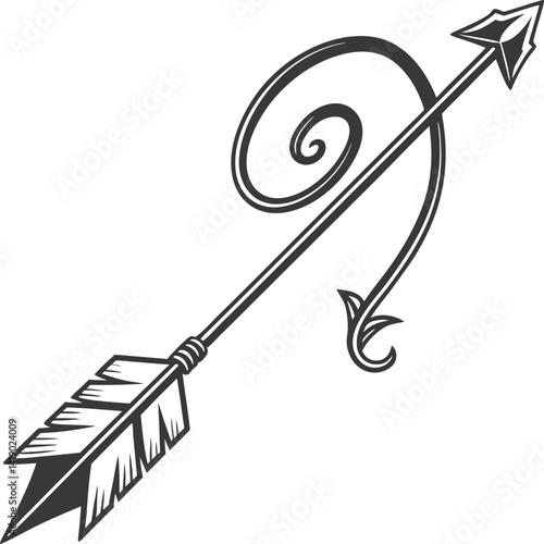Classic archery bow and arrow illustration with stylized fletching and scrollwork
