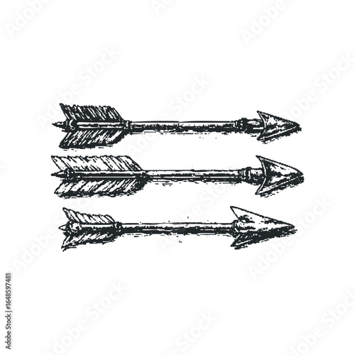Hand drawn illustration of vintage tribal arrows with detailed feather fletching on white background