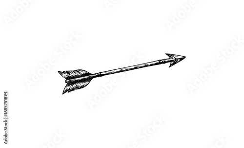 Stylized native american inspired arrow with feather fletching and sharp arrowhead in dark outline on white background