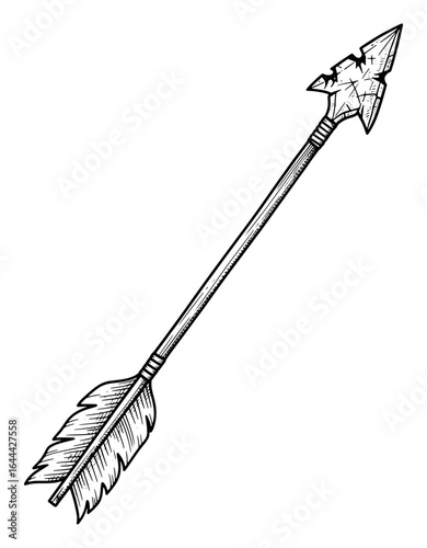 Vintage arrow with feathered fletching and arrowhead. Vector hand drawn illustration