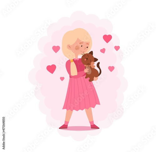 Happy girl in a pink dress joyfully hugging her fluffy dog in a flat vector illustration