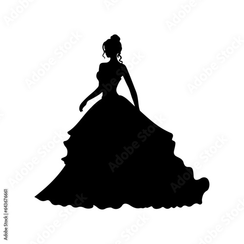 Women drees Silhouette Art design. Silhouette of a young pretty woman in long dress with frill, fluffy skirt. Bride silhouette in luxury ball gown for design. Slim female vintage style dress.
