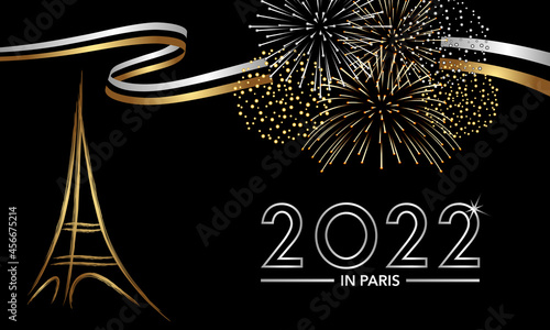 2022- carte noire, argent et or, sur le thème des fêtes nocturnes à Paris pour fêter la nouvelle année avec des feux d’artifice avec la tour Eiffel stylisée.