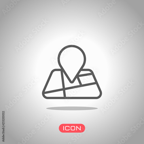 Map with pin, geo locate, outline linear icon. Icon under spotlight. Gray background