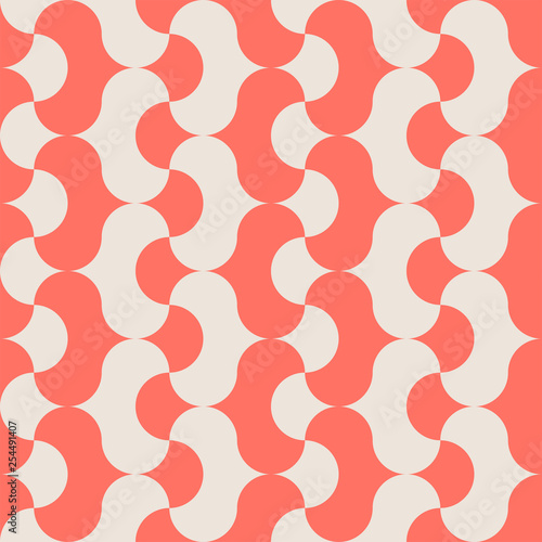 Seamless geometric pattern of circles on a coral background. Simple geo pattern. Clothing fabric print, wrap paper textile. Living coral. 2019 color