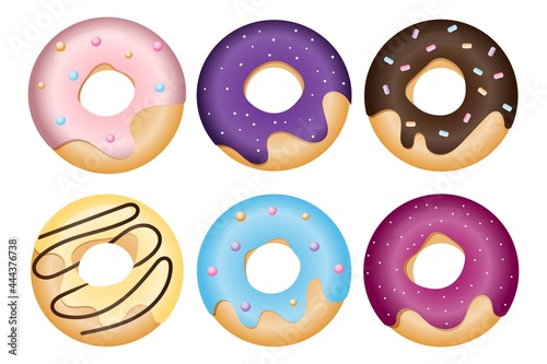 Doughnut set. Donuts in sugar glaze with sprinkles. Vector image