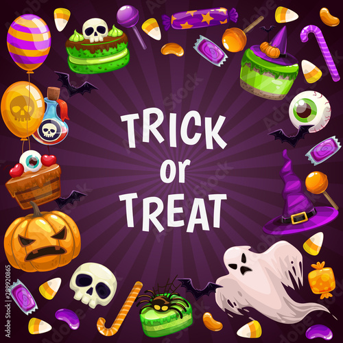 Happy Halloween, Trick and Treat card designs set. Funny spooky postcard templates for holiday night with Helloween pumpkin, spider. Kids flat graphic vector illustration isolated on white background