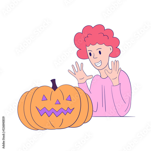 The girl rejoices at the pumpkin. Image in modern style with modern colors. Halloween flat vector illustration isolated on white background
