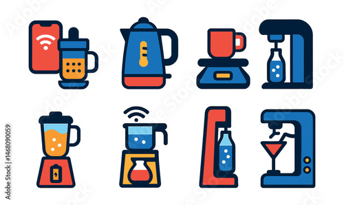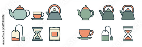 Tea and kettle flat icons set. featuring teapot, kettle, and floral design symbols