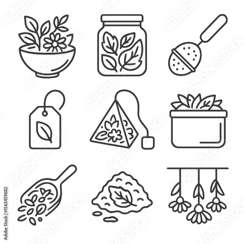 Tea Herb Icons. Line style icons of drying herbs for tea: herbal tea mix, dried leaves in jar, infuser icon, tea label tag, tea
