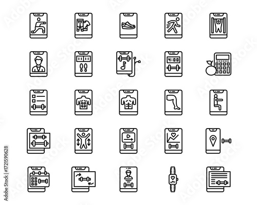 Set of line icons related to gym, fitness. Outline icon collection related to wellness, workout, exercise. Editable stroke. Vector illustration