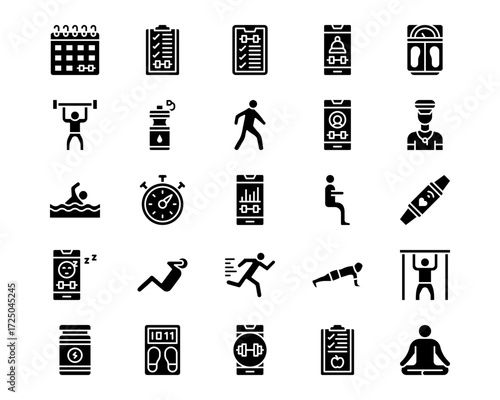Health kick icon set. Containing heart, water, kettlebell, calories, lifting, strengthening, exercise and more. Solid vector icons collection